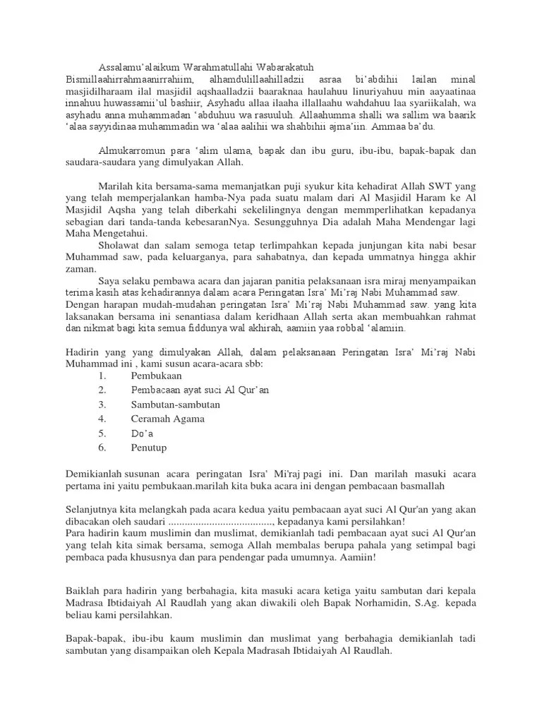 Contoh Teks Pembawa Acara Isra Mi Raj Singkat : Contoh Teks Mc Pada Acara Pengajian Rutin Youtube : Contoh naskah teks mc pada acara formal singkat · pembawa acara bahasa jawa .. Contoh mc ini memakai bahasa jawa yang singkat dan gampang dipahami. Mulai dari salam pembuka, mukadimah, dan dalil pada program yang sesuai. Namun, mc dengan suara merdu akan menarik dan membuat betah audiens. Inilah naskah mc acara peringatan isra' mi'raj nabi muhammad saw yg diselenggarakan di masjid. Alhamdulillah, alhamdulillahilladzi an'amana 'ala dinil islam wal iman, asyhadualla ilahaillallah wa asyhaduanna muhammadarrosululloh, allahumma .